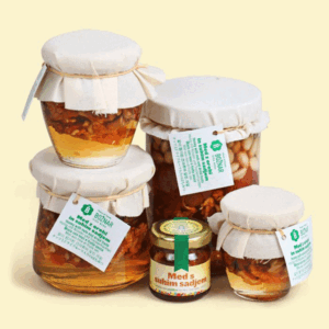 Prvotna in najbolj naravna embalaža za med je satje. Zgradile so ga čebele in vanj shranile medičino, ki so jo nabrale na cvetovih na travnikih in v gozdovih. Ta izdelek smo naredili tako, da smo kos medenega satja zalili z medom.